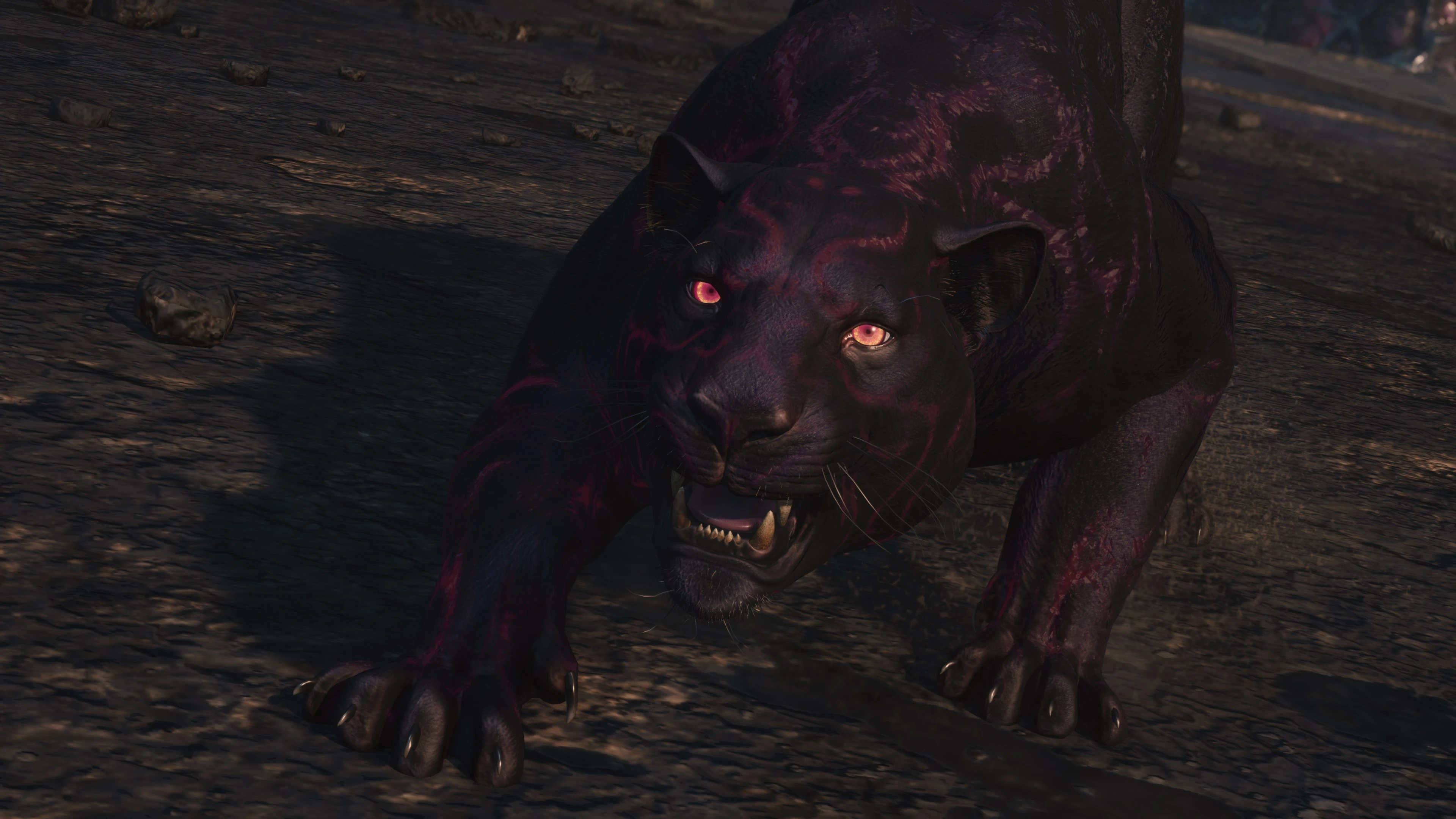 Turn a corner a little too fast or a little too obliviously, and Declan might literally run into what appears to be a huge black panther, all fangs and claws and taut, coiled muscle. It startles to a stop, ears pinning back in annoyance, tail sweeping back and forth. A low, rumbling sound emanates from the hollow of its throat, looking at him with red eyes.